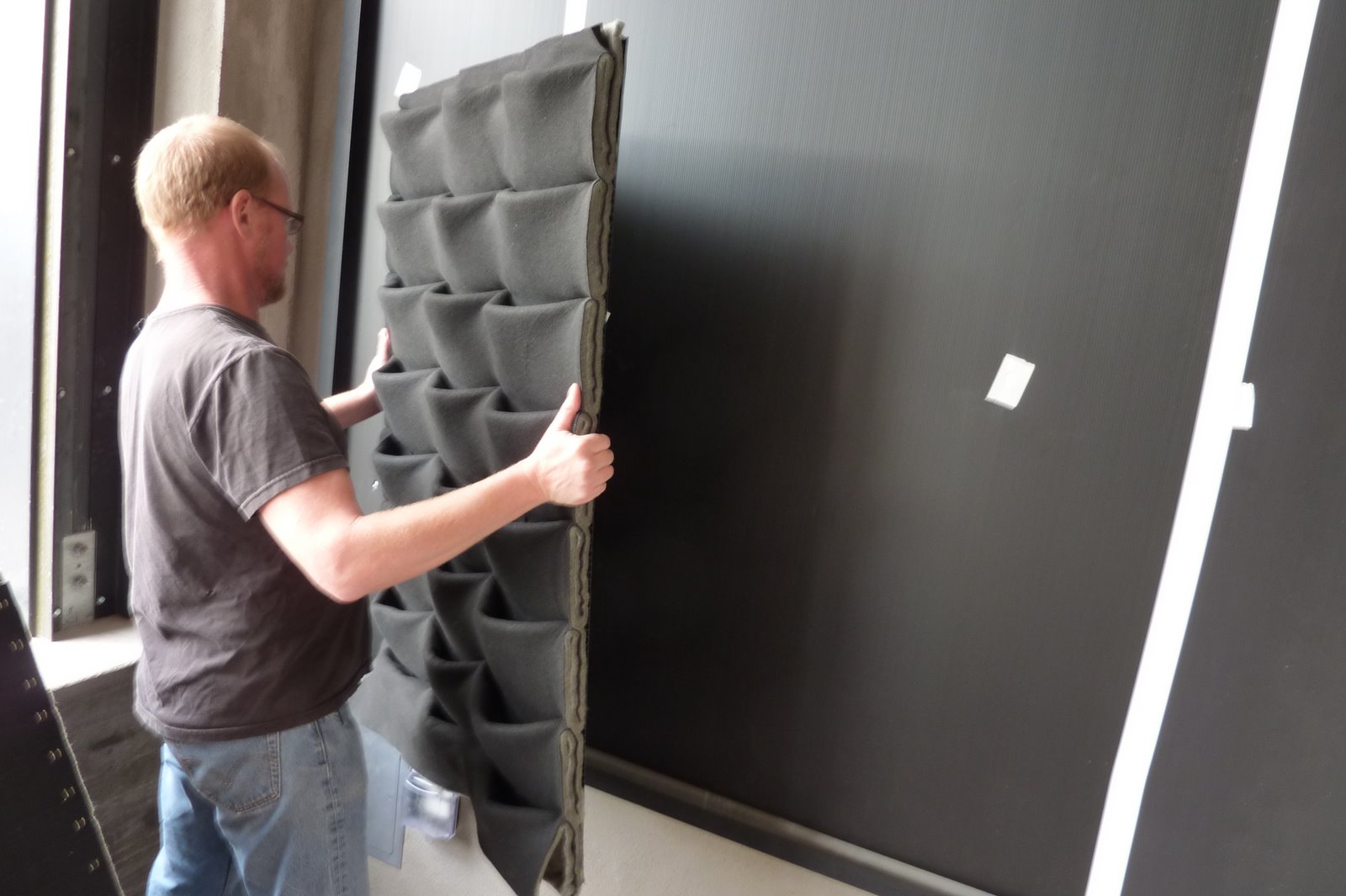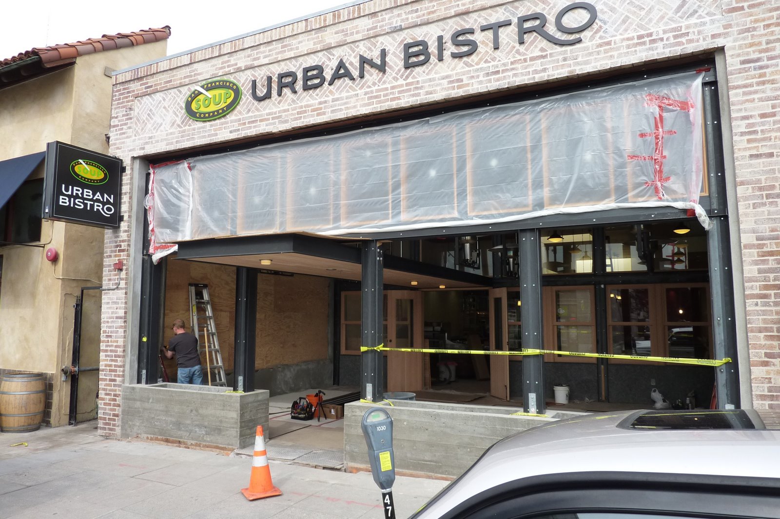San Francisco Soup Kitchen opens a new Urban Bistro in the high-end shopping district of Burlingame just south of San Francisco. Their open air covered patio area is shaded with lots of bright light which is perfect for a living wall of ferns. The nearly completed build-out made us ready to install a living wall kit 17' 9" wide by 8' 0" high. The Florafelt full-pocket panels with black cover felt and painted black galvanized frame nearly cover the entire left wall of the space. Panels are made ready to receive the 320 root-wrapped ferns to be installed the next day.