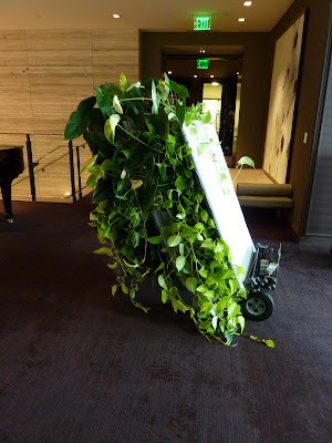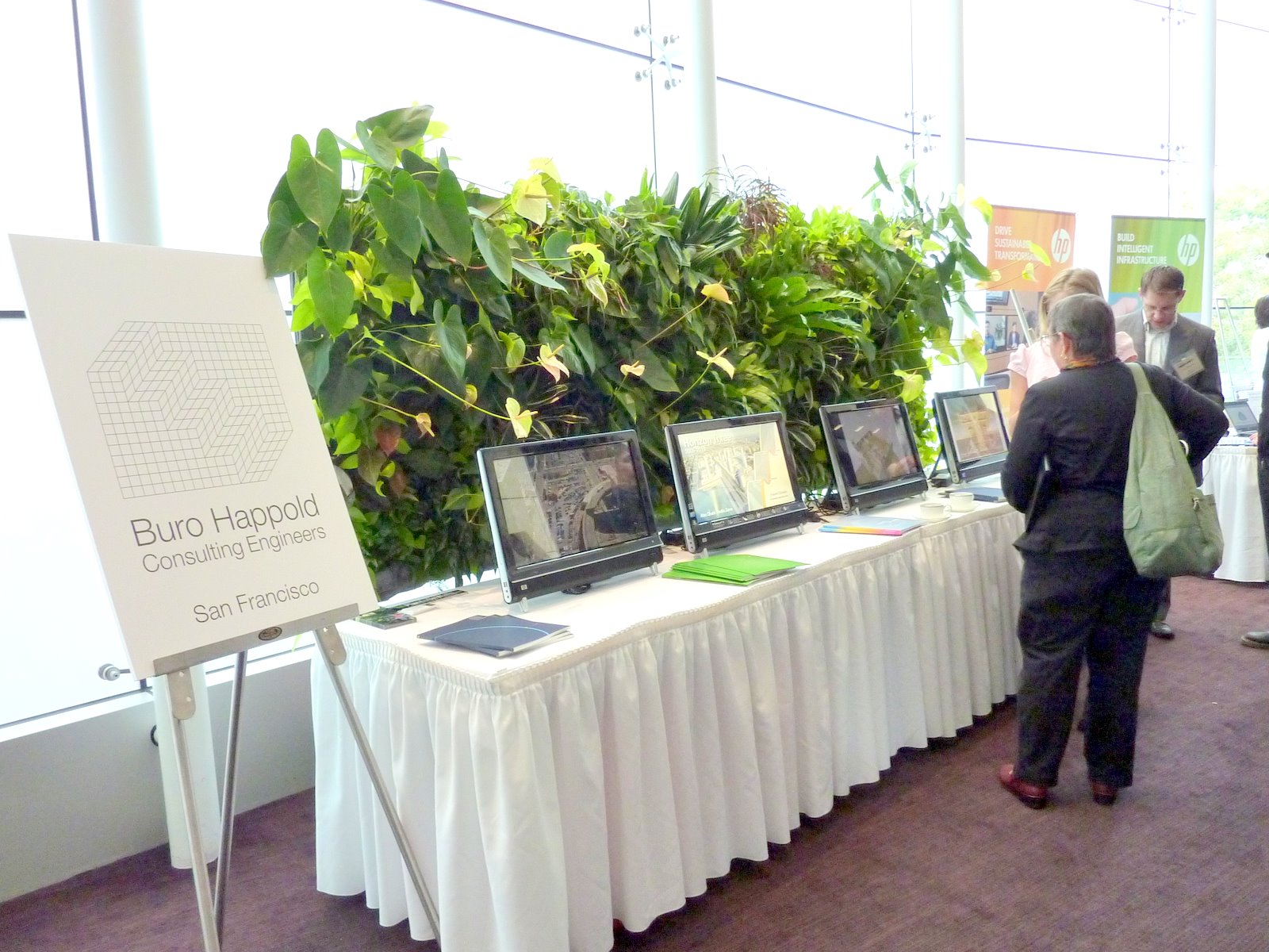 The living 4 wall panels that were growing at Snidle Gallery in San Francisco were transported to the Saint Regis Hotel 5 blocks away to be displayed for the Sustainable Industries Forum. The mature living wall has been growing for 9 months. The 30 pound panels were supported by pipe frames to create a living backdrop for Buro Happold Consulting Engineers. After the one day exhibition the panels were returned to the sunny windows of the gallery.