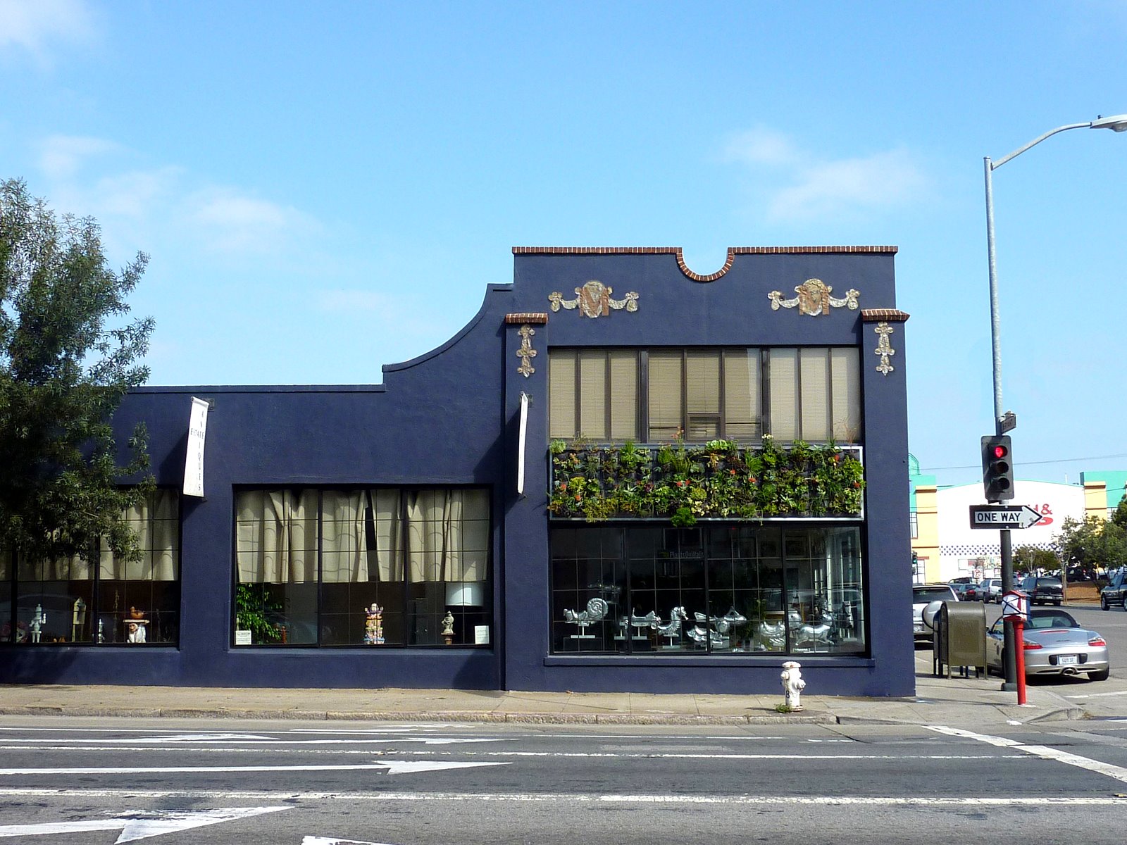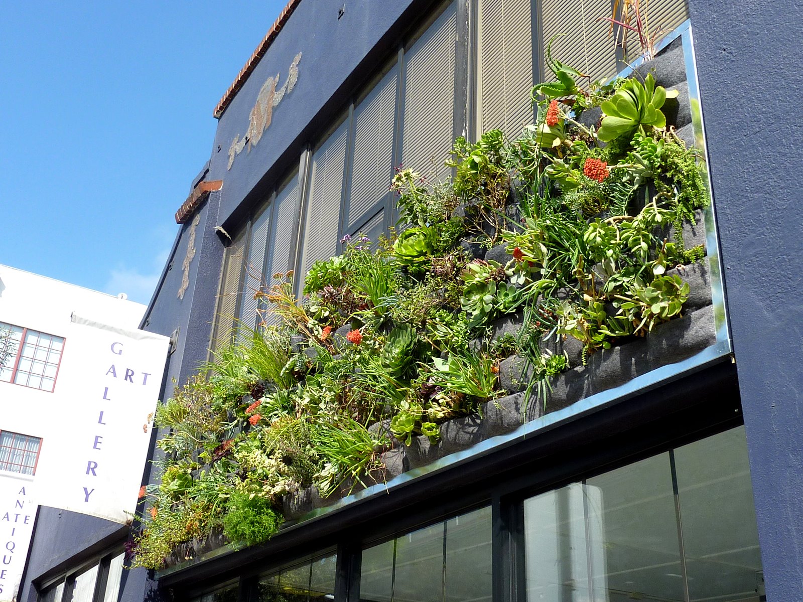 A custom Living Wall was installed on the facade of James Snidle Gallery. The custom living wall measures 15'-6" x 3'-9" and uses the Full-pockets panels. A wide variety of drought-tolerant full-sun type plants were placed into the 126 pockets. Plant choices include succulents, grasses, woody shrubs, herbs, and california native plants. Come and visit the living wall to see how it grows in. James Snidle Gallery, 1190 Bryant (at 10th Street in SOMA district), San Francisco, CA 94103.