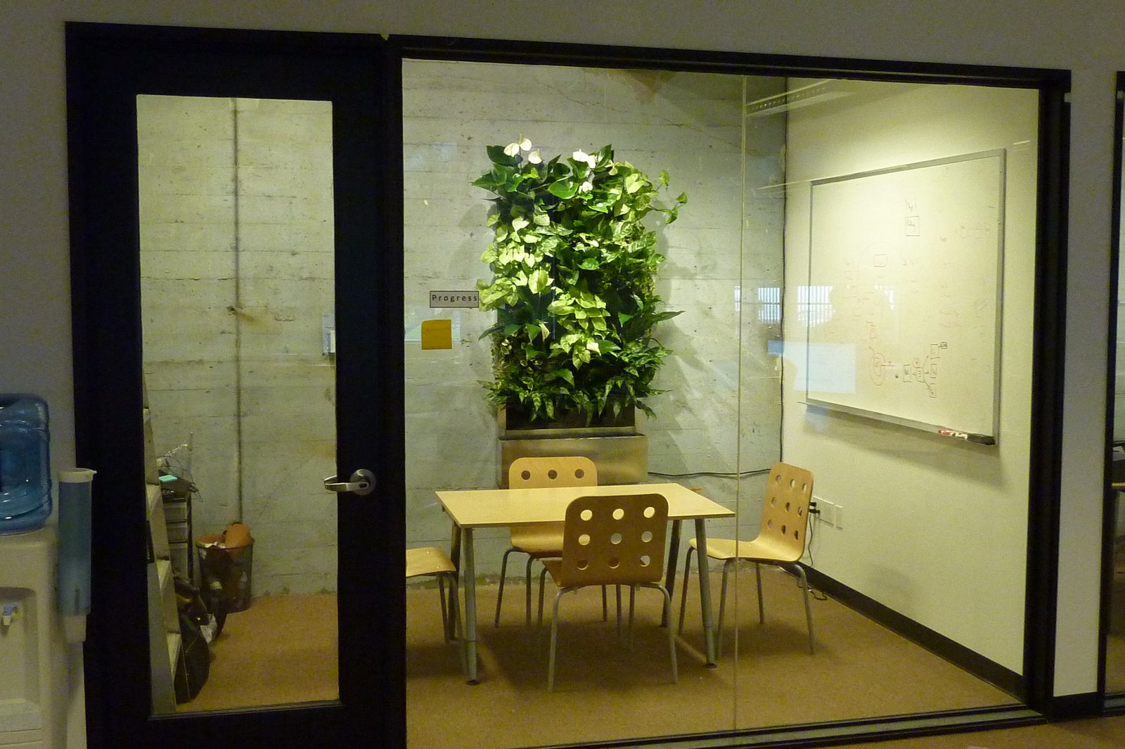 Ondeego of San Francisco ordered a living wall planted up with low-light tropicals to add life to their meeting room. The Floraframe Recirc-24 was mounted to the raw concrete wall and filled with 24 plants. Now they are inspired by green.