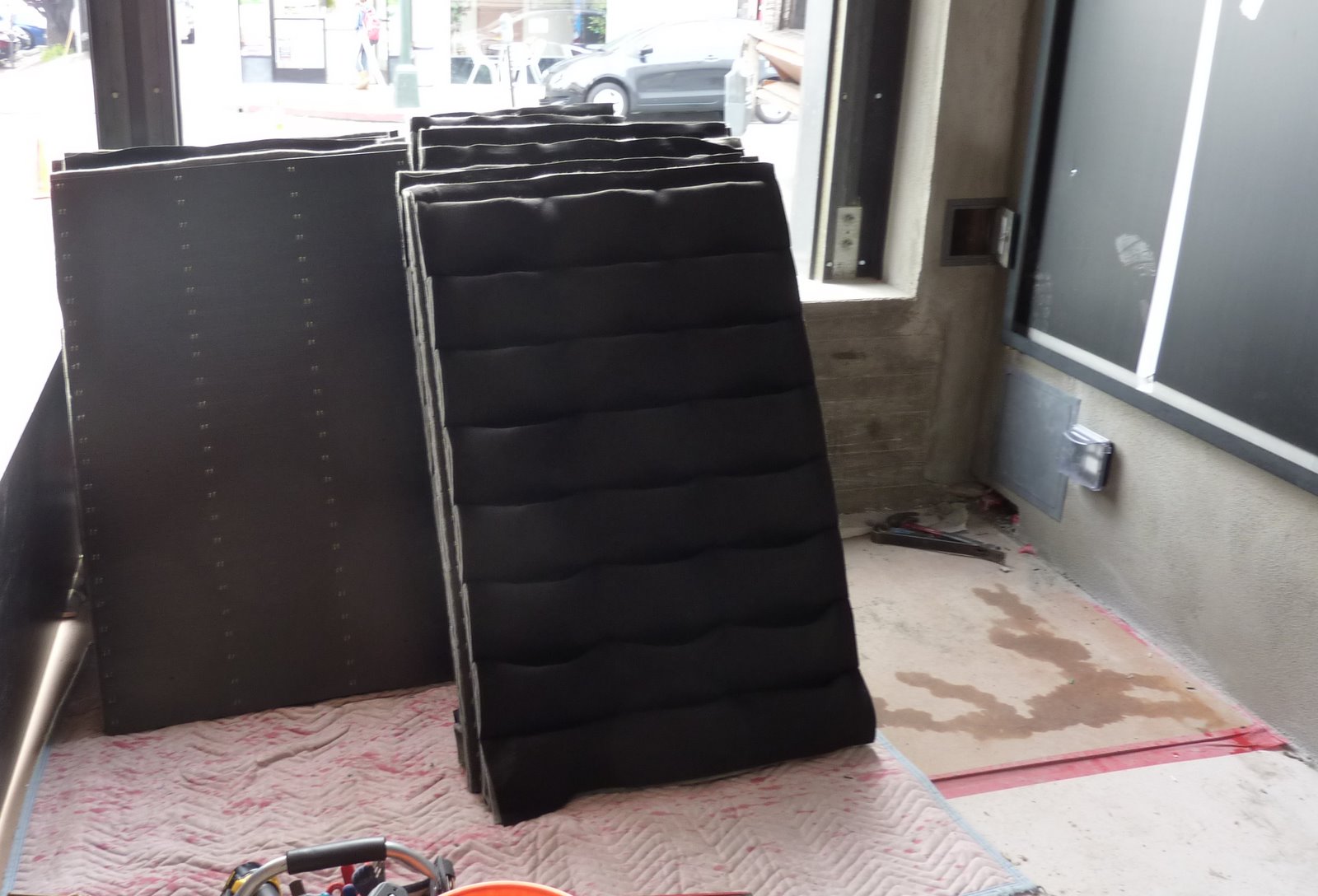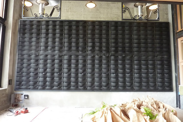San Francisco Soup Kitchen opens a new Urban Bistro in the high-end shopping district of Burlingame just south of San Francisco. Their open air covered patio area is shaded with lots of bright light which is perfect for a living wall of ferns. The nearly completed build-out made us ready to install a living wall kit 17' 9" wide by 8' 0" high. The Florafelt full-pocket panels with black cover felt and painted black galvanized frame nearly cover the entire left wall of the space. Panels are made ready to receive the 320 root-wrapped ferns to be installed the next day.