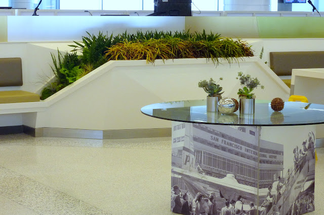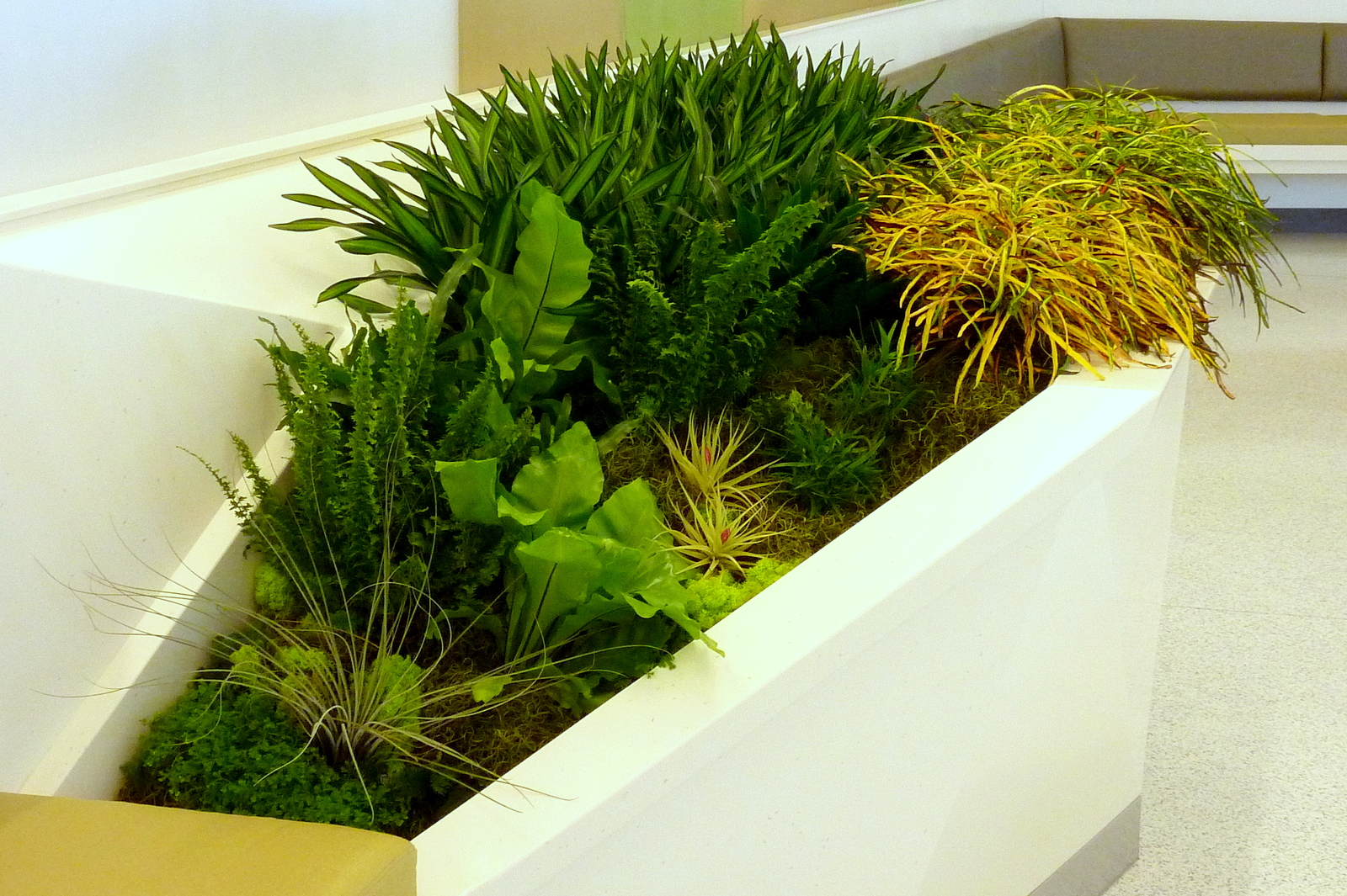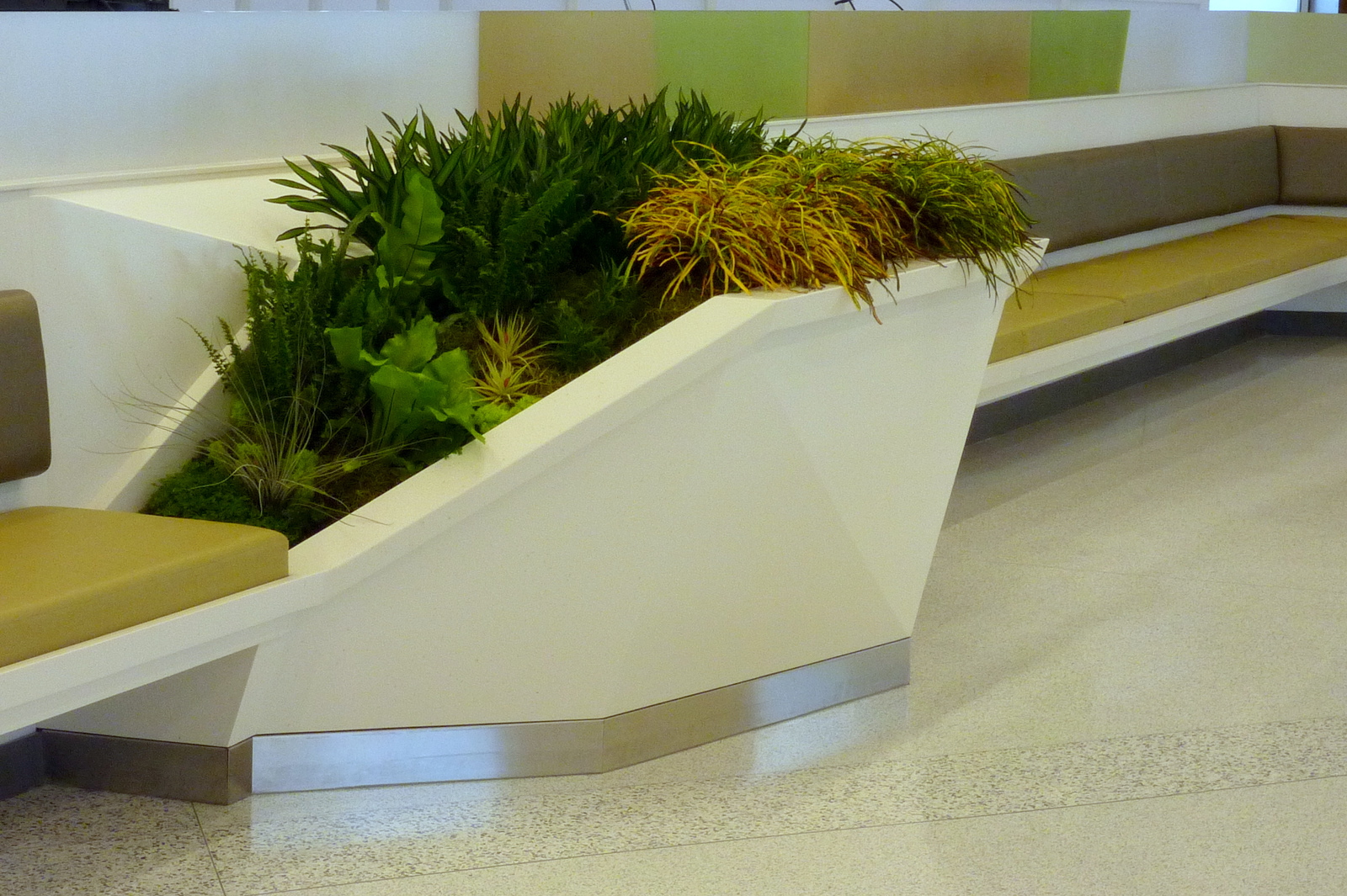 Designers at San Francisco Airport's new Terminal 2 used PlantsOnWalls Florfelt living wall panels to create sloping displays in their planter boxes. Full-pocket panels were trimmed to fit the odd shapes and filled with tropical plants. Decorative mosses were hot-glued to the felt to fill around the edges.