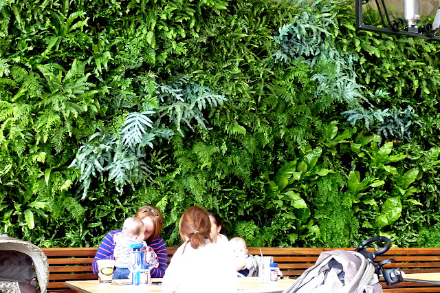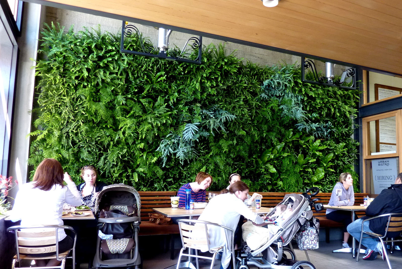 Ferns float over delighted mom's and children on another beautiful day in Burlingame California. Urban Bistro's open front patio features a 14 foot wide living wall 10' above the floor. The vividly fresh ferns fill the space with natural delight.