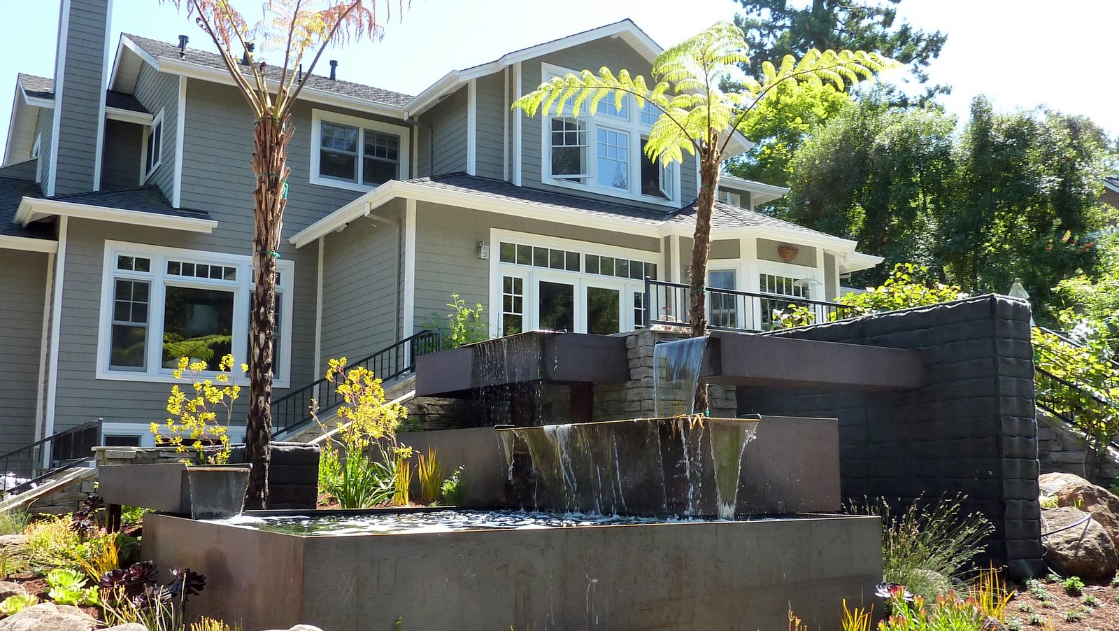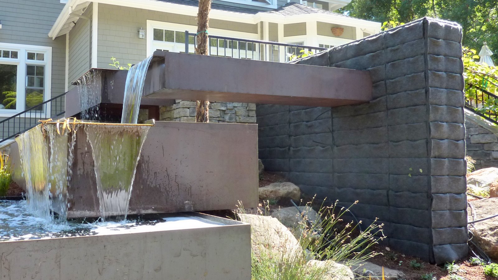 PlantsOnWalls Florafelt Vertical Garden Planters to create vertical garden elements among core tin steel water elements for this San Carlos home. Florafelt planters cover the vertical forms and planter boxes are integrated on the top. Landscape designer Tim O'Shea from