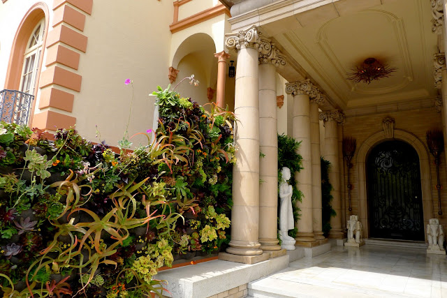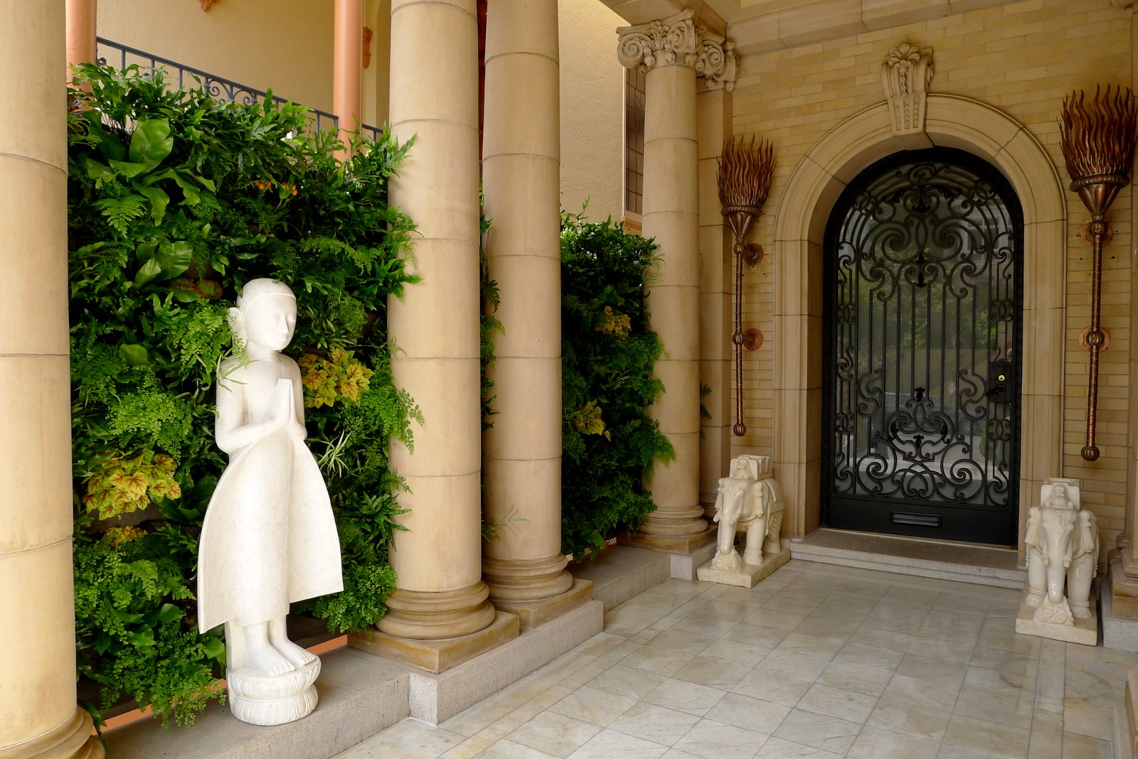 How can an elegant, traditional entrance to a stately San Francisco home, be re-imagined to be greener and more welcoming, if not otherworldly? Living Green, partnering with Plants On Walls to create a southern exposed vertical melange of succulents and coppery oxalis that morphs into a private shady fern grotto, was part of the solution. Add the pristine white marble floors that one would find in a rajah's palace or in the fabled Moroccan Casbah Tamador, that the late and great maestro, Luciano tempo, so skillfully restored. Throw in fantastical light fixtures, created by non other than the Luciano himself, and a pair of stunningly beautiful elephants to welcome the weary traveler.