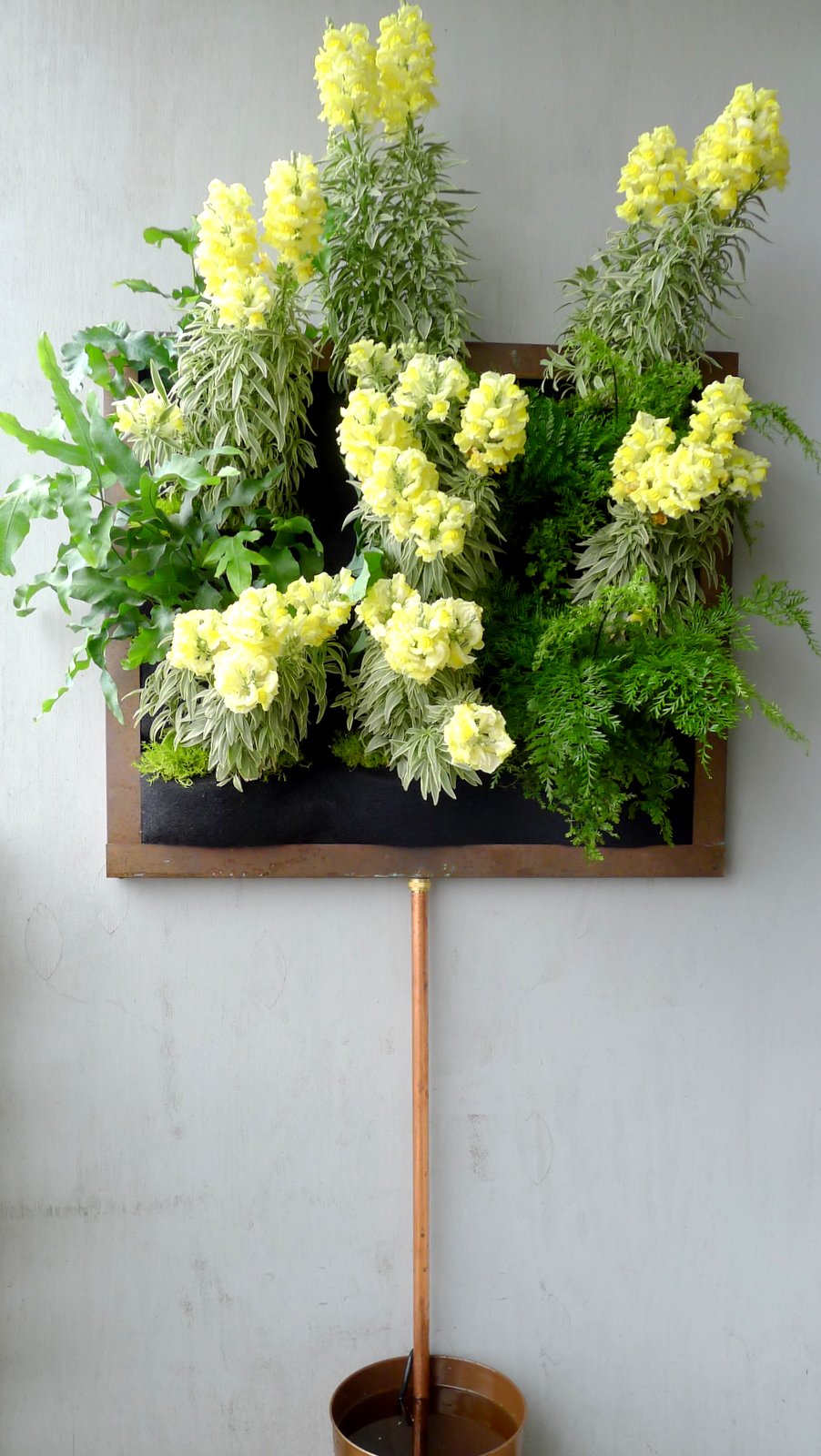 A copper framed Florafelt F12 billows lemon yellow snaps with ferns. A pump in the copper bin wateres the unit every day for 30 minutes. Just top of the water weekly and enjoy. Get Florafelt Vertical Planters at PlantsOnWalls.com
