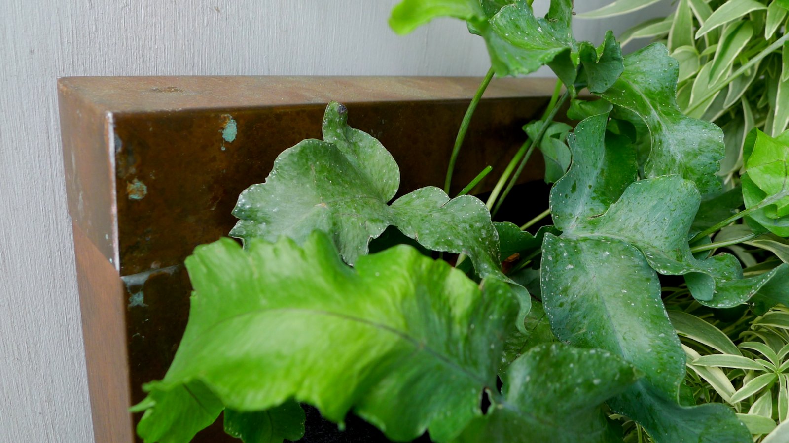 A copper framed Florafelt F12 billows lemon yellow snaps with ferns. A pump in the copper bin wateres the unit every day for 30 minutes. Just top of the water weekly and enjoy. Get Florafelt Vertical Planters at PlantsOnWalls.com